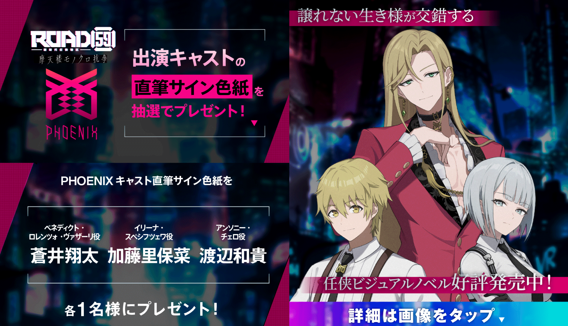 「ROAD59 -新時代任侠特区- 摩天楼モノクロ抗争」の発売を記念して「PHOENIX」キャスト3名のサイン色紙がそれぞれ1名様に当たるキャンペーンをROAD59公式Xにて開始いたしました。